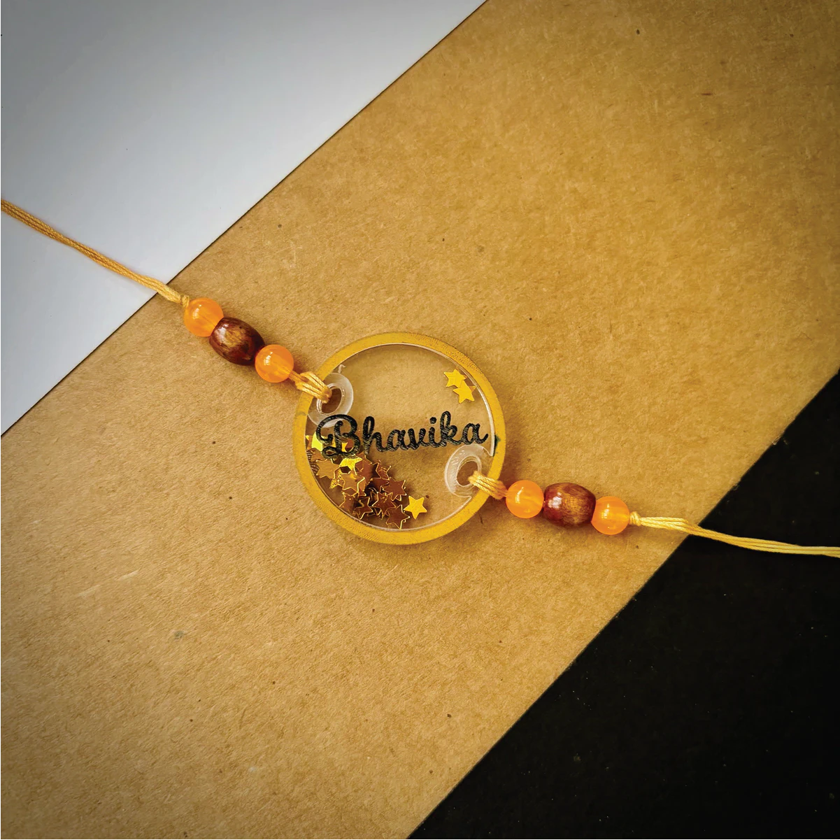 Glitters filled name rakhi – orange